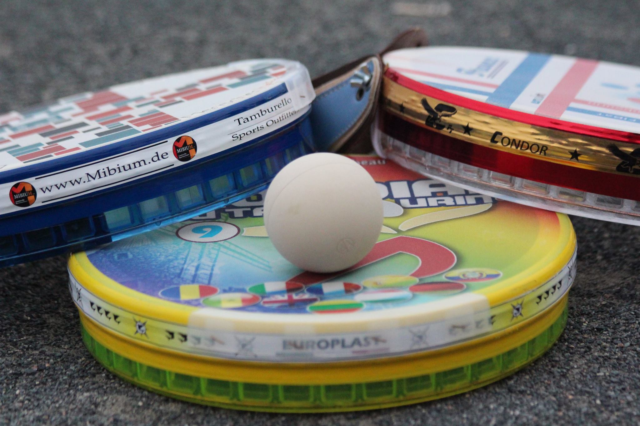 Openschläger mit Metallring im Rahmen; kleiner Hartgummi-Ball (80g)